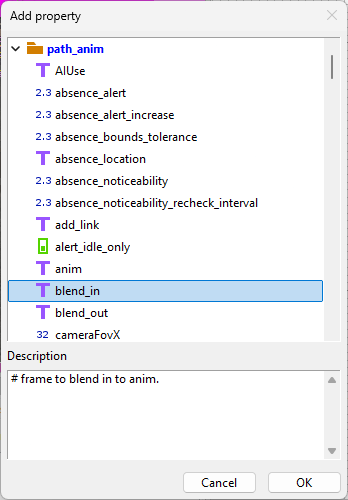 "path_anim" has those two properties: blend_in blend_out "path_cycleanim" has by default blend_in property. In both cases they don't seem to be doing anything. By changing values in tdm_ai_base.script one can change transitions from e.g. walk to run, but is there a way to control transitions between idle animations at all?