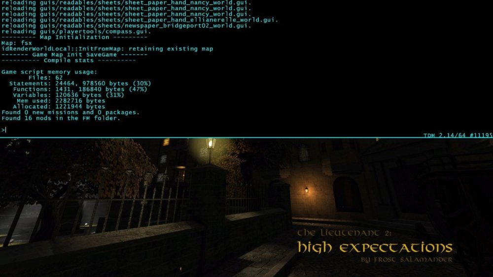 This has been a recurring issue for me over the past year or so and I'm finally fed up enough with it to make a forum post about it. I've not been able to find anything else with either a forum or discord search, so I'm hoping I can get some troubleshooting assistance here. Sometimes, on larger maps with lots of custom assets and/or scripting, when I'm attempting to load a save file the game just... hangs. At like 1% loaded, in the loading screen. This happens to me a lot with Seeking Lady Leicester, but also has started happening to my most recent playthrough of The Lieutenant 2. Some relevant notes: - I am on the latest beta branch, but this has been happening to me since at least 2.13, so I don't think its a beta-specific bug. - I'm on Windows 10. - Starting a fresh run of the map does not ever reproduce this problem (I can reliably fresh-load a map even when I can't save-load it), and it doesn't happen until I close the game and reopen it (so, if I start a new mission and play a bit, I can reliably load save files if I get caught or whatever. Its not until I save after a long gaming session and try to pick up where I left off later that I occasionally hit this bug). - Usually I get around this issue with a complete reinstall of TDM? But my most recent reinstall didn't do it for my playthrough of Lieutenant 2. - Once this happens to me, there's no way for me to close the game or go back to the main menu. I have to alt+F4 or Task Manager kill TDM. - When I'm loading a save or a new map and its working correctly, I am unable to open the dev console. However, when I get stuck in this bad state, the dev console is openable. I've attached a screenshot of the contents of the dev console just in case its illuminating, although there are no scary looking errors or warning text that I can see. If we want me to try any commands when I get into this state I'd be happy to poke around. Let me know if this explanation makes sense, or if there's anything I should try or any debug info I should poke around the game's folder for.