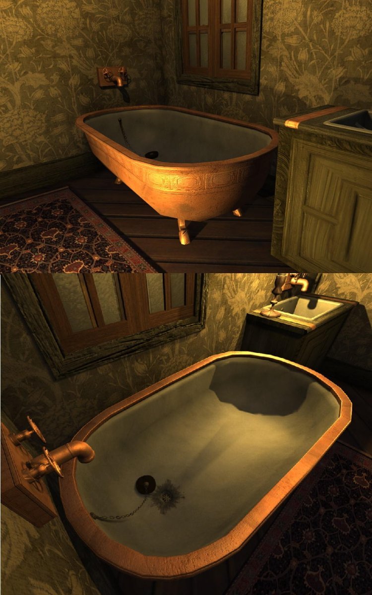 Updated/alternative version of the stock bathtub. You'll need the noshadows version of the inner texture - -------------------------------------------- textures/darkmod/stone/flat/smooth/marble_greenish_ns { surftype15 description "tile" noshadows qer_editorimage textures/darkmod/stone/flat/smooth_marble_greenish_ed diffusemap textures/darkmod/stone/flat/smooth_marble_greenish { blend specularmap map _white rgb 0.2 } } --------------------------------------------- bathtub02.lwo